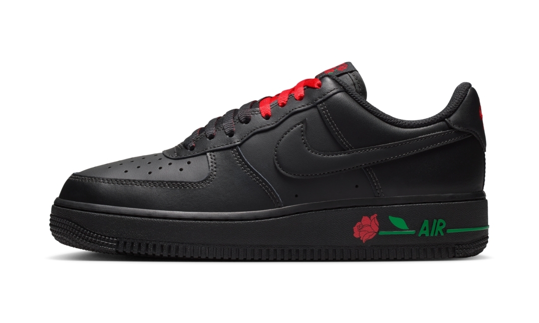 ブラックカラーのレザーアッパーに、レッドカラーのインソールと、ミッドソールの「AIR」にはバラのアイコンを配置した一足。