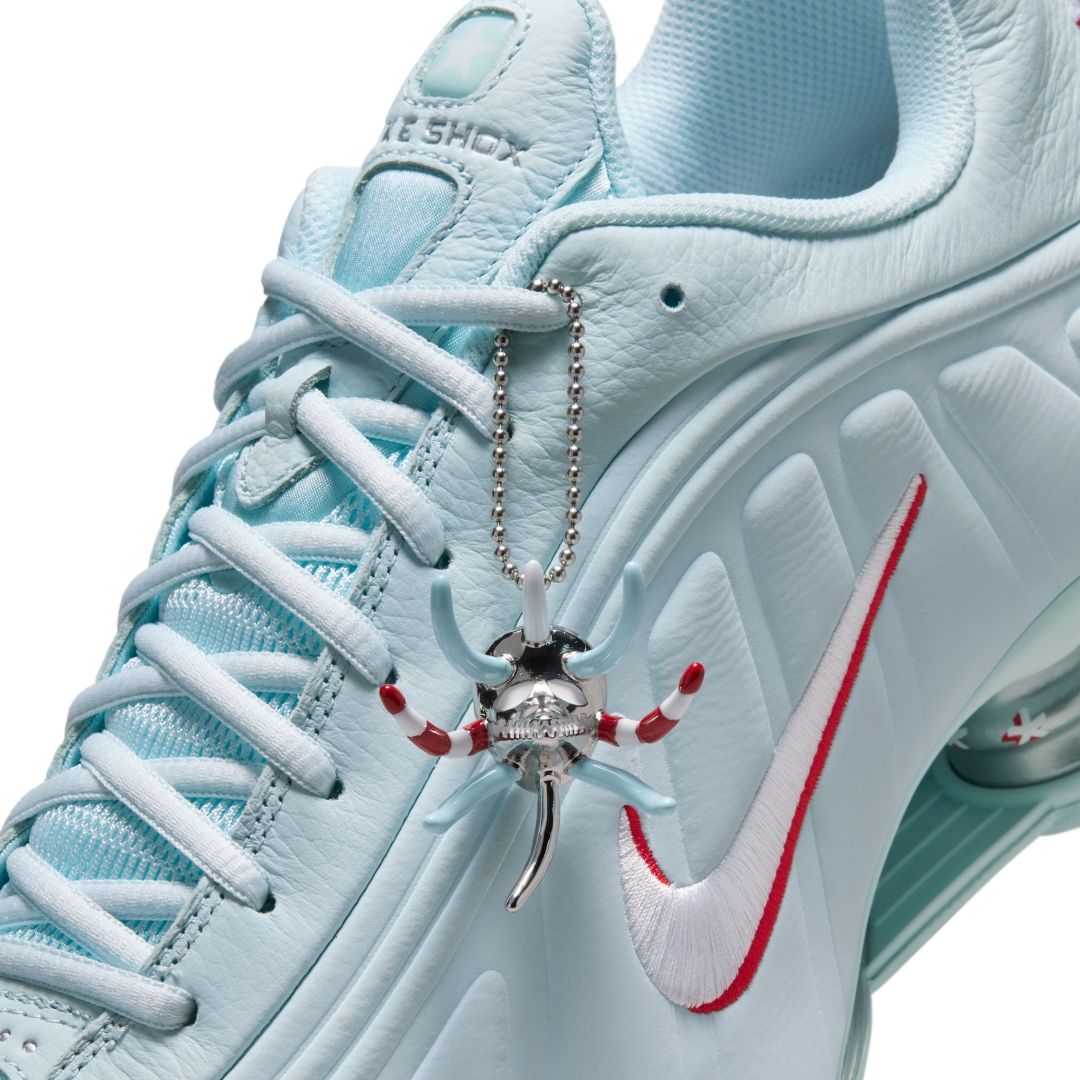 ランニングモデルをベースにShox テクノロジーを搭載した「SHOX R4」から、”Glacier Blue/University Red/Metallic Silver/White”カラーの配色を施した一足。
