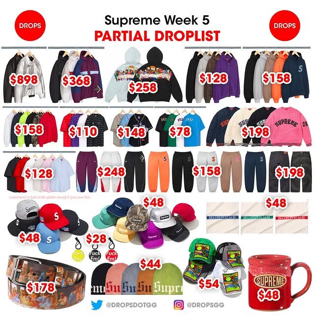 その他に、「SUPREME x AOI “Embroidered Hooded Work Jacket & Camp Cap”」、「Supreme x Yonex “EZONE 100 Racquet is set”」が登場予定。